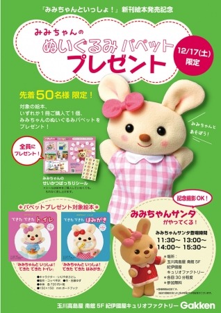 株式会社学研ホールディングス(東京・品川 代表取締役社長:宮原博昭)のグループ会社、株式会社学研教育みらい(東京・品川 代表取締役社長:宮原雄一)は、のべ60万人に読まれてきた園児向け月刊絵本『みみちゃんえほん』のキャラクター「みみちゃん」が登場する新刊絵本『みみちゃんと いっしょ!できた できた トイレ』『みみちゃんと いっしょ!できた できた はみがき』発売を記念し、東京・二子玉川・玉川高島屋店内 紀伊國屋書店 キュリオファクトリーにて「みみちゃんサンタ」着ぐるみふれ合い&パペット人形・シールプレゼントイベントを開催いたします。