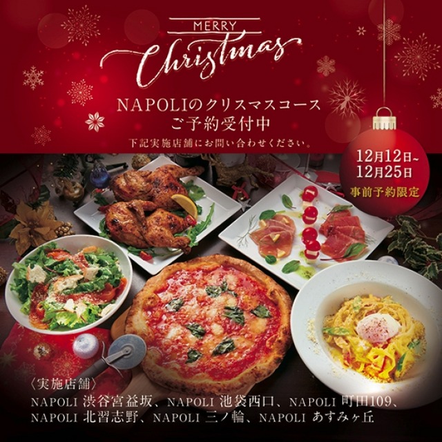 株式会社遠藤商事・Holdings.(本社:東京都目黒区、代表取締役:遠藤優介)は、「PIZZERIA BAR NAPOLI(ピッツェリアバール ナポリ) 渋谷宮益坂、池袋西口、町田109、北習志野、三ノ輪、あすみヶ丘」の6店舗にて、2016年12月12日(月)~25日(日)までのクリスマス期間に、事前ご予約限定のクリスマスプランを発売致します。