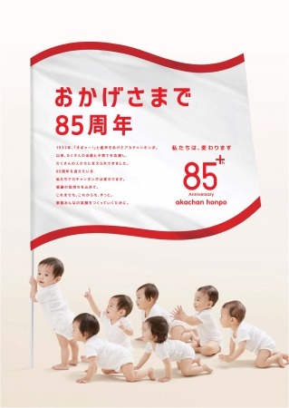 2017年、創業85周年を迎えるにあたり、オリジナルロゴマークに加えて、お客様の赤ちゃんにご協力いただき、赤ちゃん本舗の想いを込めた企業メッセージのビジュアルを作成しました。この1年間、さまざまな商品・イベント・キャンペーンを通じて赤ちゃん本舗を支えてくださったお客様をはじめ、皆さまへの感謝の気持ちをお伝えしてまいります。