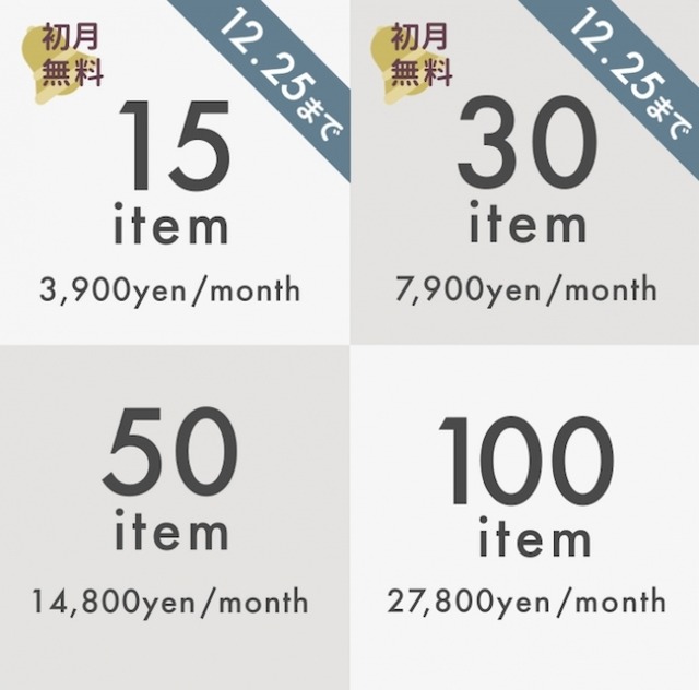 月額 ¥3,900/15点、¥7,900/30点、¥14,800/50点、¥27,800/100点