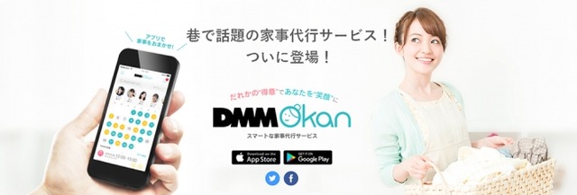 アプリは、家事代行依頼者向けの「DMM Okan-家事代行アプリ」と家事代行スタッフ向けの「家事代行おしごとアプリ-DMM Okan」の2種類があり、双方のアプリを使って家事代行の依頼から家事代行スタッフのマッチング、料金の支払いまでをスマートに提供します。リリース時は、東京23区にお住まいの家事代行依頼者と、その周辺地域にお住まいの家事代行スタッフが対象になります。(順次エリア拡大予定)