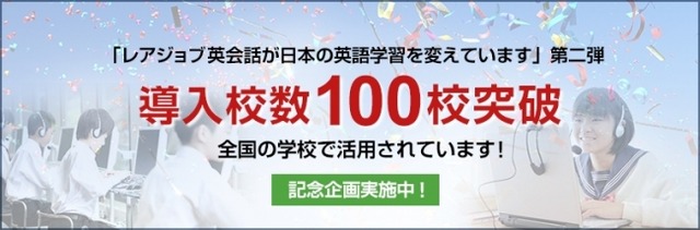 オンライン英会話サービス事業を運営する株式会社レアジョブ(本社:東京都渋谷区、代表取締役社長:中村 岳、以下「レアジョブ」)は、教育機関向けサービス導入数が100校を突破したことを発表します。また、突破を記念して開催する「レアジョブ英会話が日本の英語学習を変えていきます」の第二弾として、教育機関向け記念企画を開始いたします。