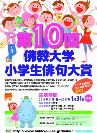 今回で10回目を迎える、「佛教大学小学生俳句大賞」は、全国の子どもたちに俳句を通して言葉の楽しさを体験してもらいたいとの願いで2007年度から開催しています。テーマは自由です。今回も全国の小学生の皆さんからアイデアあふれる作品を募集します。締め切りは2017年1月31日必着です。