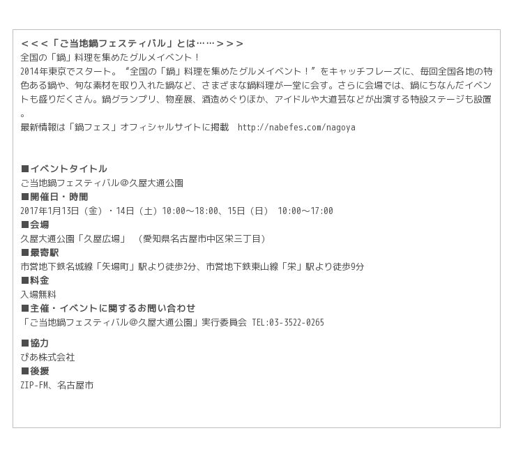 2017年1月13日(金)~15日(日)に久屋大通公園にて、「ご当地鍋フェスティバル」が開催されます。