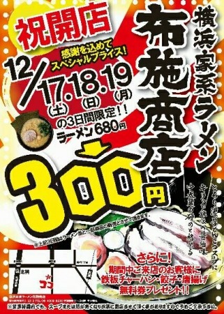 株式会社ギフト(本社:町田市原町田、代表:田川翔)が運営する「横浜家系ラーメン町田商店」系列は、2016年12月17,18,19日(土~月)の3日間にわたり、布施商店にてラーメン一杯を300円で提供する“開店 感謝祭イベント”を開催いたします。