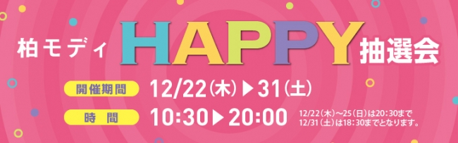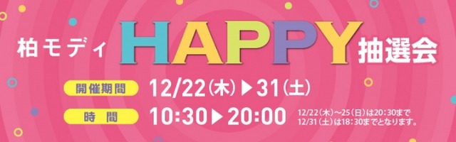 おかげさまで、今年10月にオープン以来、ご好評いただいておりますマルイグループの「柏モディ」(千葉県柏市)では、12月22日(木)より、「柏モディHAPPY抽選会」を開催いたします。
