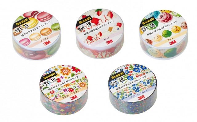 「スコッチ(R) @!テープ」は、「スコッチ(R) メンディングテープ」の基材にデザインが入った、新感覚のデザインテープです。“貼るとテープが目立たずキレイ”、“テープの上から文字が書ける”といった、メンディングテープならではの特長を活かし、ラッピングなどにぴったりの「デコレーションテープ」シリーズと、ひと言メッセージを書き込める幅広タイプの「メッセージラベルテープ」シリーズの、2つのタイプを展開しています。今回は「デコレーションテープ」シリーズに5種類の新柄が登場。貼ると柄だけが立体的に浮き出て見えるスイーツ柄3種類と、テープの透明感を活かしたフラワー柄2種類の、合計5種類が加わります。