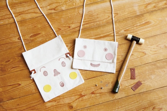 ランドセルの革やスタンプを使って、ポシェットの表面にオリジナルの顔をデザインします。トンカチ