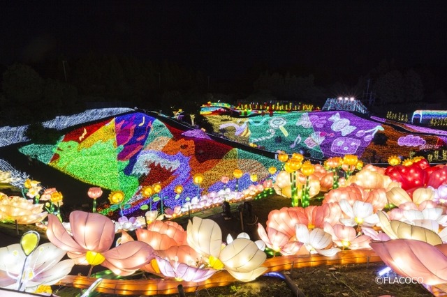 伊東市の「伊豆ぐらんぱる公園」では、開園50周年を迎えた2015年よりイルミネーションを開始。2年目となる今年は、イルミネーション特設エリアのデザインを全面リニューアルし、LEDの球数も前年の210万球から400万球へと倍増。敷地面積に対するLEDの球数が世界有数の高密度となりました。人気のジップラインも、夜間は「日本初!イルミネーション上空にかかるジップライン」に変身します。(点灯期間:2016年11月11日(金)~2017年8月(予定) 住所:伊東市富戸1090)