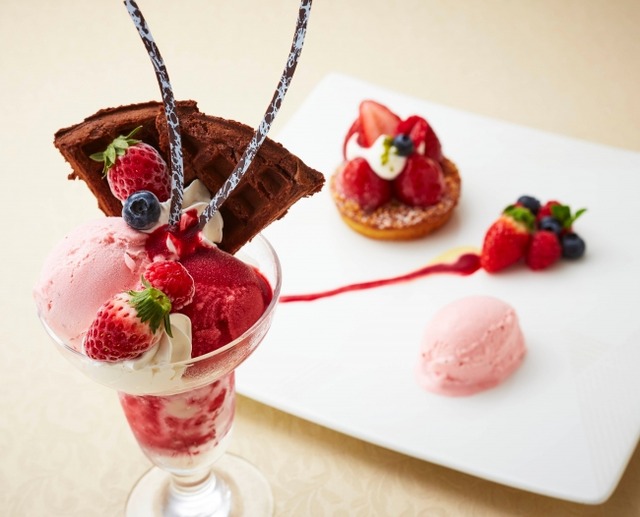 ロビーラウンジ「フォンテーヌ」では、ケーキ・タルト・パフェなどのデザートメニュー4種と、いちごとクリームチーズ・チョコレートとのマリアージュを楽しむドリンク2種をご用意。また、「フォンテーヌ」とメインバー「ロイヤルスコッツ」共同で、バータイムには、リキュールにディップする新しい楽しみ方の「ストロベリーピラミッド」をはじめ、果実に酔いしれる創作カクテル4種をご提供いたします。