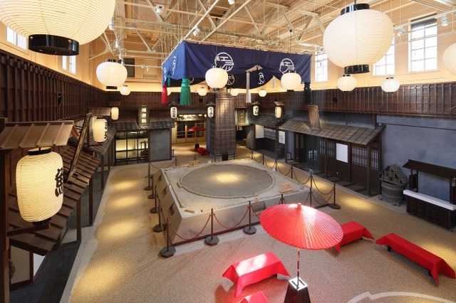 江戸の町屋を意識した空間に全12の和食店が軒を連ねる館内。その中央には堂々と構えるのが日本相撲協会監修の土俵。江戸時代から両国で興行が行われていた相撲の魅力の発信として、両国国技館の同じサイズで設置いたしました。11月25日の開業以降、多くのお客様にご注目頂いた土俵ですが、ついに九州巡業から帰ってきた日本相撲協会の方々によって、土俵開きが執り行われます。