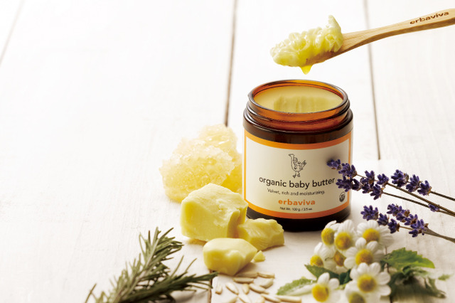 erbaviva 冬季売り上げNo.1、リッチなうるおいを与える全身用保湿バーム。保湿効果の高いミツロウ、肌を柔軟にするココアバター(カカオ脂)、乾燥による肌荒れを防ぐローマカミツレ花油やラベンダー油などのオーガニック成分を配合。高保湿の植物オイルが固形化されたバームは、肌にのせると体温で溶け、すぐになじんでべた付きません。食品基準のオーガニック認証(USDA)取得。デリケートな赤ちゃんのデイリーケアはもちろん、乾燥の激しいひじやかかと、ネイルやリップ、髪のパサつきなど、あらゆるパーツケアにおすすめです。