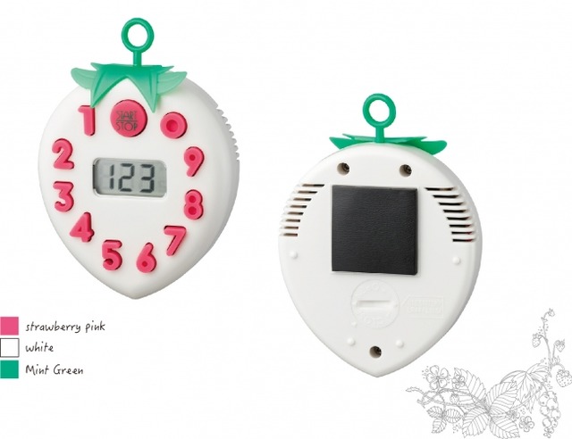 清潔感のあるホワイトカラーとピンクのボタン、スイートカラーのいちごタイマーも、