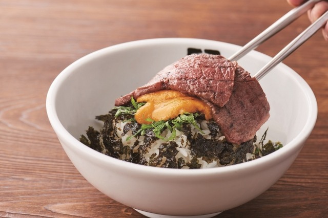 目利きのプロが厳しく選んだこだわりの和牛と風味の強いうには、上品な味わいの和牛と相性が良く、焼いた和牛から滴る甘い脂とよく合います。