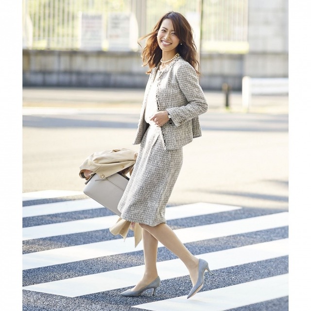 セレモニーウェア定番ブラックの、はじめましての「きちんと感」と「私らしさ」を備え洗練された大人の女性を印象づけ、堅苦しく見えすぎないほどよい抜け感があるるノーカラー仕立てのジャケットとフレアースカート。入学式では、シンプルにホワイトのブラウスを合わせるだけで、ぱっと明るい印象になります。卒業式なら、アクセや小物で適度に自分らしさを出して、着こなしをドレスアップさせても◎。