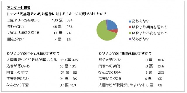 株式会社留学情報館(東京都新宿区、代表:大塚庸平、以下留学情報館)は、ドナルド・トランプ氏の大統領選挙勝利を受け、それによってアメリカ留学のイメージがどう変化したかを調査しました。その結果、7割近くの人がアメリカ留学へ不安を感じており、具体的には1.「入国審査やビザ取得」2.「治安」3.「為替」などに不安を抱えていることが分かりました。