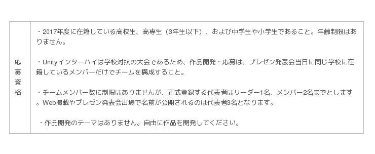 作品申し込みの注意点など詳細についてはUnityインターハイ2017公式Webサイトからご確認ください。