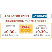 満期特約定期預金「楽天エクステ預金(フラット)」に「15年もの」を追加