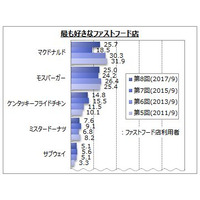 最も好きなファストフード店は「マクドナルド」「モスバーガー」が利用者の各3割弱。「マクドナルド」は2…