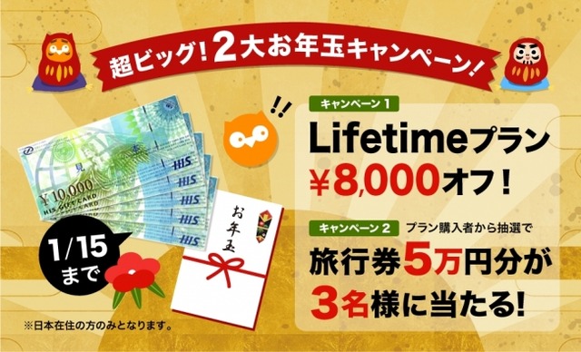 プラン購入者特典:5万円分の旅行券をLifetimeプラン購入者から抽選で3名様にプレゼント