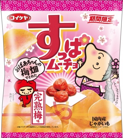 株式会社湖池屋(本社:板橋区/社長:佐藤章)は、女性を中心にご支持いただいている酸味系ポテトチップス「すっぱムーチョ」シリーズより、“すっぱムーチョ×岡畑農園 おばあちゃんの梅畑”で収穫した完熟梅を使用した「厚切りすっぱムーチョ 完熟梅味」を2017年1月9日より全国コンビニエンストア、「すっぱムーチョチップス 完熟梅味」を2017年1月16日より全国・全チャネルにて発売します。