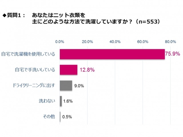 型くずれが気になるニット衣類の洗濯ですが、ドライクリーニングではなく、自宅での洗濯が多数派です。中でも、洗濯機で洗っている人が約76%と高率であることは、手間を掛けたくないという意識の現れだと言えます。