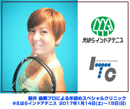兵庫県を中心に全20施設を運営するITCテニススクールは、平成29年1月14日(土)~15日(日)の二日間、えばらインドアテニスへの変わらぬご愛顧に感謝をこめて、スクール生様・松山ローン会員様対象の限定特別企画、2007年全日本テニス選手権ダブルス勝者・新井 麻葵プロをお迎えして、『年はじめスペシャルクリニック』を開催します。