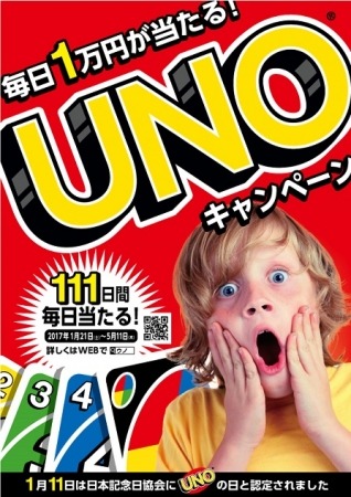 また、このたびの『UNOの日』制定を記念して2017年1月21日(土)~2017年5月11日(木)にて、抽選で毎日1万円が当たる「UNOキャンペーン」(http://uno-cp-jp.com)を実施いたします。