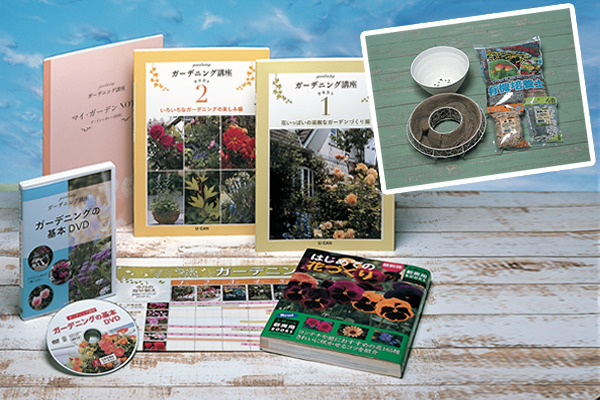 テキスト2冊、花づくり事典(『はじめての花づくり』主婦の友社)1冊、DVD1巻「ガーデニングの基本DVD」、「ガーデニングカレンダー」「寄せ植えレシピ12ヵ月」表裏、添削ノート「マイ・ガーデンノート」、マスターキット2作分(鉢・リース型バスケット・鉢底石・水苔・培養土)、ガイドブック ほか