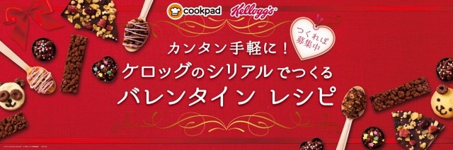 レシピサービス「クックパッド」に期間限定で「かんたん手軽に!ケロッグのシリアルでつくる バレンタインレシピ」の特設ページが登場します。このページでは詳しい作り方を写真も交えてご紹介しているほか、実際にクックパッドユーザーのみなさんがレシピにチャレンジした際の「つくれぽ(「つくりましたフォトレポート」)」が順次投稿されていくので、調理におけるコツやポイント、オリジナルのアレンジなども参考にできます。さらに自信作が完成した際にはご自分の「つくれぽ」を投稿していただくこともできるので、「おしゃれにできた」「簡単にできて楽しかった」など、その時の気持ちと一緒にレシピのレポートをシェアすることができます。