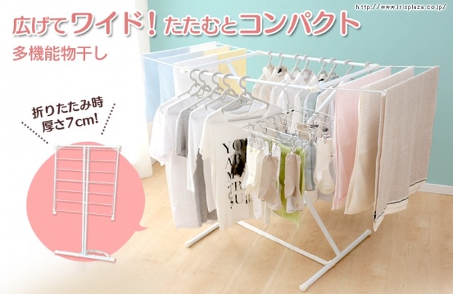 アイリスオーヤマ株式会社(本社:仙台市、代表取締役社長:大山 健太郎)のグループ企業である株式会社アイリスプラザ(宮城県仙台市青葉区中央2丁目1-7 アイリス青葉ビル TEL:0120-323-410)では、たっぷり衣類が干せて畳んでコンパクトに収納できる『コンパクト多機能物干し CTM-750』を2017年1月10日に新発売いたしました。花粉の季節や雨の日の部屋干しにも、サッと干せて場所を取らない使いやすさと便利さを追及したシンプルな物干しです。