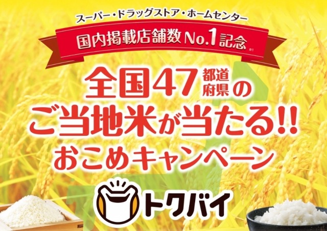 株式会社トクバイ(本社:東京都渋谷区、代表取締役:沖本裕一郎)は、全国47都道府県全ての小売店のチラシ・特売情報がチェックできるサービス「トクバイ」にて掲載店舗数国内No.1(※)を記念して、日頃よりアプリを利用いただいている方、また今後ご利用いただける方へ、抽選で2017名にお礼の気持ちを込めた「全国47都道府県のご当地米が当たる!!おこめキャンペーン(こめきゃん)」を開催します。