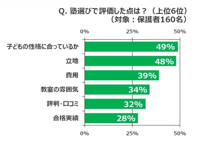 はじめに、保護者に「子どもの塾選びで評価した点」をききました。その結果、1位は「子どもの性格に合っているか」(49%)となりました。「立地」(48%)や「合格実績」(28%)よりも重視しています。
