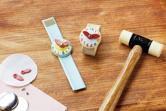 毎月早い段階て゛予約か゛埋まる人気のワークショッフ゜、2月は針をくるくると手て゛動かせる、革ヘ゛ル トの腕時計をつくります。針をトンカチて゛つけて、文字盤に自由に数字を書きます。 完成したら、腕につけて時間の勉強か゛出来るおもちゃの腕時計て゛す。 親子て゛思い出に残る手作り体験をお届けします。