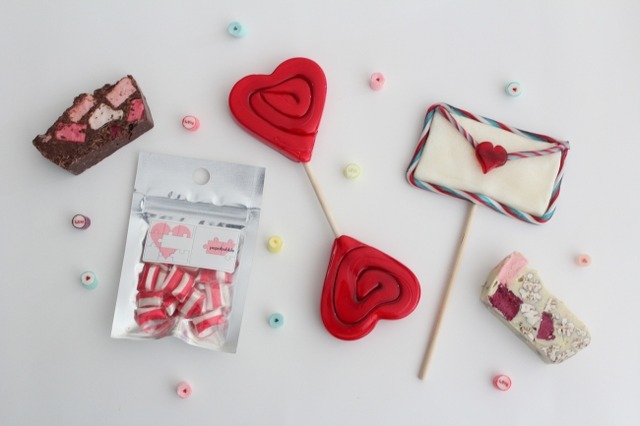 また、両端から食べていただきたい2つのハートと、手紙の代わりに渡していただきたいレターでメッセージを伝える2種の「ロリポップ」や、人気のチョコレート菓子「ロッキーロード」などもご用意しております。