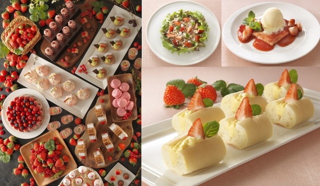 「春のいちごフェスティバル」では、苺を使用したデザート約20種類と軽食を含む約30種類のお料理が並びます。デザートは、苺のミルフィーユ、苺のショートケーキ、スパークリングワインのゼリー&苺のほか、苺ビュッフェの目玉として「ふわふわバニラ風味のエスプーマ&苺」や、炎の演出をお楽しみいただける「苺のクレープフランベ(お一人様1皿限定)」を、シェフがお客様の目の前で仕上げを行うスタンドクッキングで提供します。軽食では、「苺と生ハム手毬寿司風」など苺を使ったメニューのほか、「あめ色玉葱と香味野菜・牛すじカレー」などランチとしてお召し上がりいただけるメニューもご用意しています。