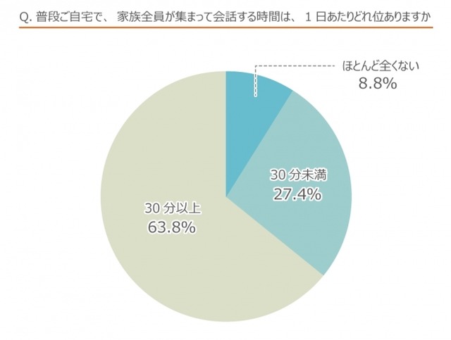 普段、家族全員が集まって会話する時間(一日あたり)を聞いたところ、63.8%が「30分以上」と回答。