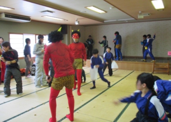 豆まき集会では児童が豆を投げて、学生が鬼となり行事を盛り上げます。