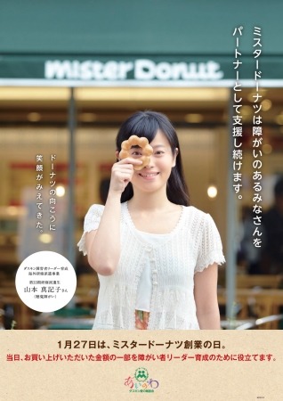 毎年1月27日にミスタードーナツ店舗でお買い上げいただいた金額の一部を障がいのある方の自立と社会参加を支援する「ダスキン愛の輪基金※」に寄付させていただきます。