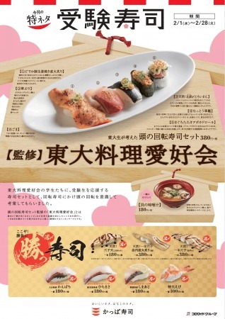 本格的な受験シーズンである2月の「特ネタ」は「受験寿司」。東大料理愛好会(※1)監修による、受験生応援の寿司セットと、「ここぞ!勝負に勝つ寿司」をコンセプトに、活(=勝つ)〆の寿司をお届けいたします。