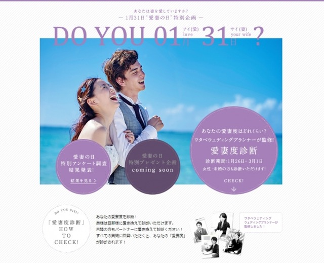 また、「愛妻の日」特設WEBサイト「DO YOU 0131(アイサイ)? ワタベウェディングプランナーが監修『愛妻度診断』」もオープンし、本調査結果をサイト内へ掲載する他、愛妻度(愛夫度)を点数方式で示す『愛妻度診断』をお楽しみいただけます。
