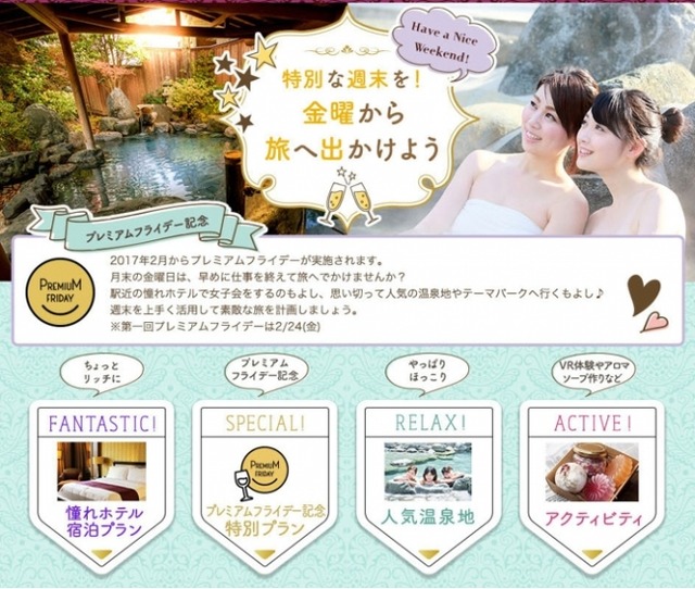 株式会社リクルートライフスタイル(本社:東京都千代田区、代表取締役社長:淺野 健、以下リクルートライフスタイル)は、2017年2月24日(金)を皮切りにスタートする経済産業省が官民連携で推進する「プレミアムフライデー」を推進する企画として、旅行サイト『じゃらんnet』とネット予約店舗数No.1(※)の飲食店予約・グルメ情報サイト『ホットペッパーグルメ』において、「プレミアムフライデー」特設ページを開設し、週末旅行や飲食の促進を行っていくことをお知らせいたします。また『じゃらんnet』は、株式会社大丸松坂屋百貨店と共同し、全国の直営9店舗において「プレミアムフライデー」の抽選会を実施いたします。