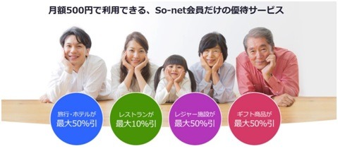 また、So-net会員の家族(*1)であれば、会員本人と同様に優待サービスを利用することができます。同じ日に家族が優待サービスを利用することも可能であるため、事前に家族と調整することなく、家族全員が好きなタイミングで希望の特典を利用できます。さらに、So-net以外のインターネット接続サービスを利用している方でも、So-net メンバーズコース(*2)に入会することで、本サービスを利用できるようになります。
