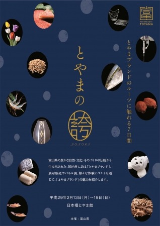 富山県では、平成29年2月13日(月)から19日(日)までの間、首都圏情報発信拠点「日本橋とやま館」において、国内外に誇る富山県の魅力を集めた『とやまブランド(http://www.toyama-brand.jp/)』の展示販売やパネル展、様々な体験イベント等を通じて、「とやまブランド」の魅力を紹介する『とやまの誇り~とやまブランドのルーツの触れる7日間~』を開催します。