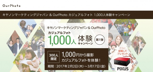 「カジュアルフォト1,000人体験キャンペーン」は、本日発表したキヤノンMJによるOurPhotoへの出資を記念して実施するキャンペーンです。同日からスタートする先着300名対象の第一弾を皮切りに順次、何気ない日常を素敵な一瞬として撮影する“カジュアルフォト”の魅力を身近に感じてもらえるキャンペーンを展開します。