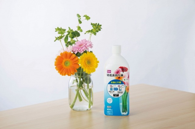 今回新発売する「DCMブランド 切花長持ち液」は、天然の食品成分トレハロースを配合し、開花に必要な養分を届けてつぼみを美しく咲かせると同時に、植物の細胞を保護して乾燥による花のしおれを防ぐ効果があります。また、水の腐敗を防ぐカビ・細菌の抑制成分により、花瓶の水換えが不要で、不足した水を追加するだけで効果が持続します。水換え時に、延命剤を水で薄めて新たに作る手間も省けるうえ、これまで必要だった茎の切り戻し作業、茎や花瓶を洗う作業もなくなり、より手軽に切花を飾って楽しむことを実現しました。