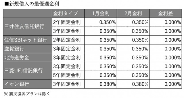 主要銀行全プランの最低金利は0.350%と前月から変わらず。比較的短期間の固定金利選択型住宅ローンを中心に低金利プランが継続