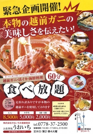 その思いを形にしたのが今回「道の駅越前」にて実施される特別企画が「越前がに」の食べ放題海鮮バイキングです。