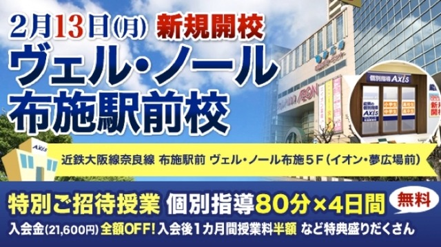 この機会に、新たに仲間入りした、個別指導Axis「ヴェル・ノール布施駅前校」をご利用ください。新校舎の見学や学習相談は、いつでも承っております。