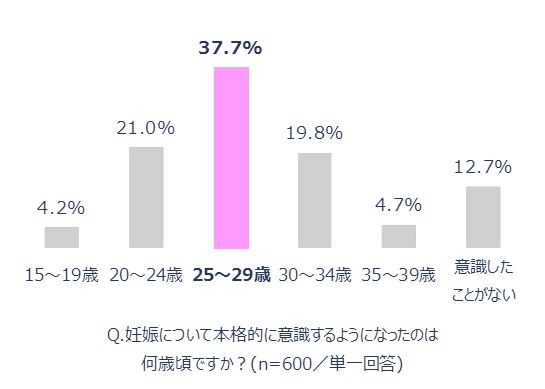 全国の現在婚活中の女性(恋人の有無を問わず)、または結婚して1年以内の女性600名のうち、妊娠を意識したことがある524名に対して、「妊娠について本格的に意識するようになったのは何歳頃ですか?」と質問したところ、全体の37.7%が「25~29歳」と回答しました。